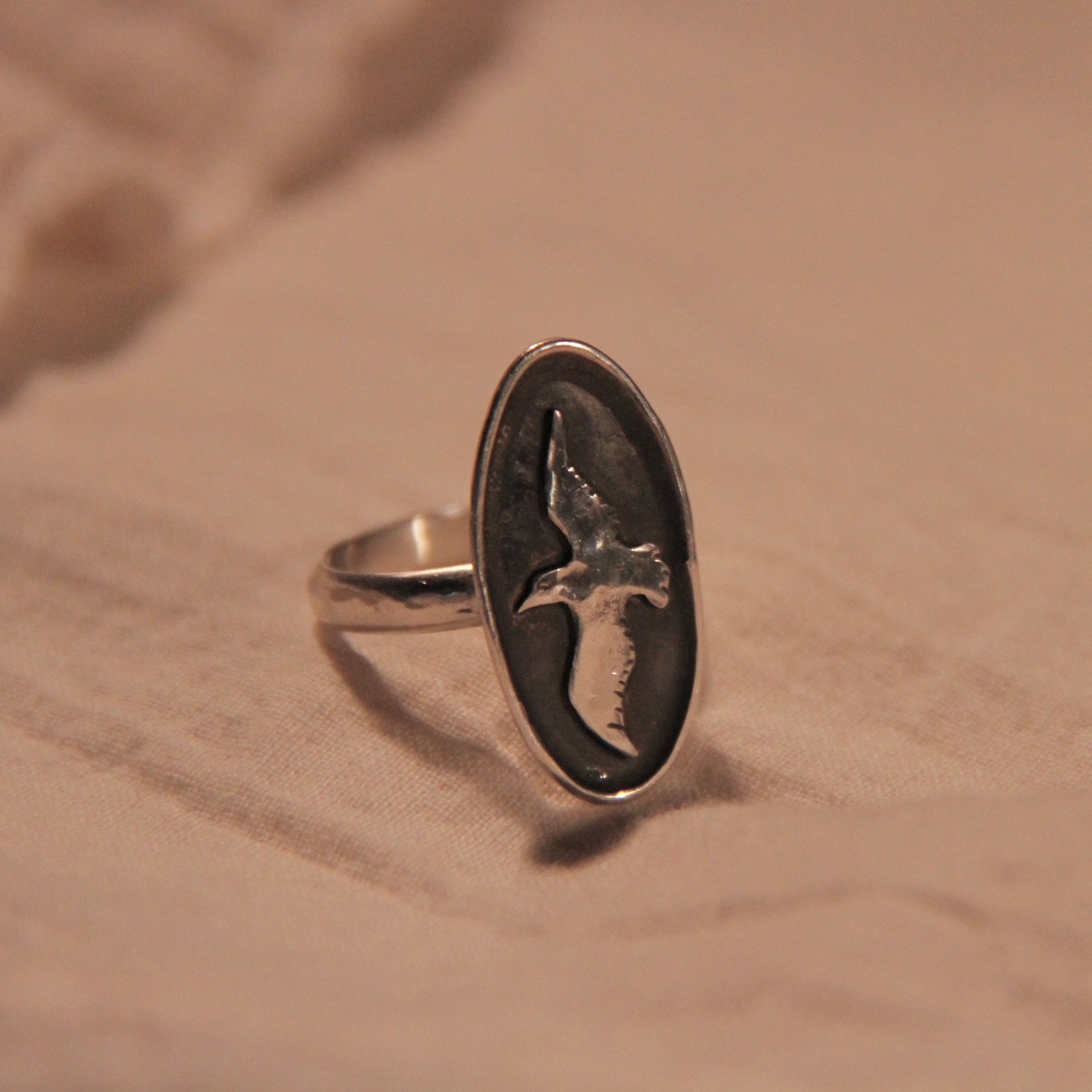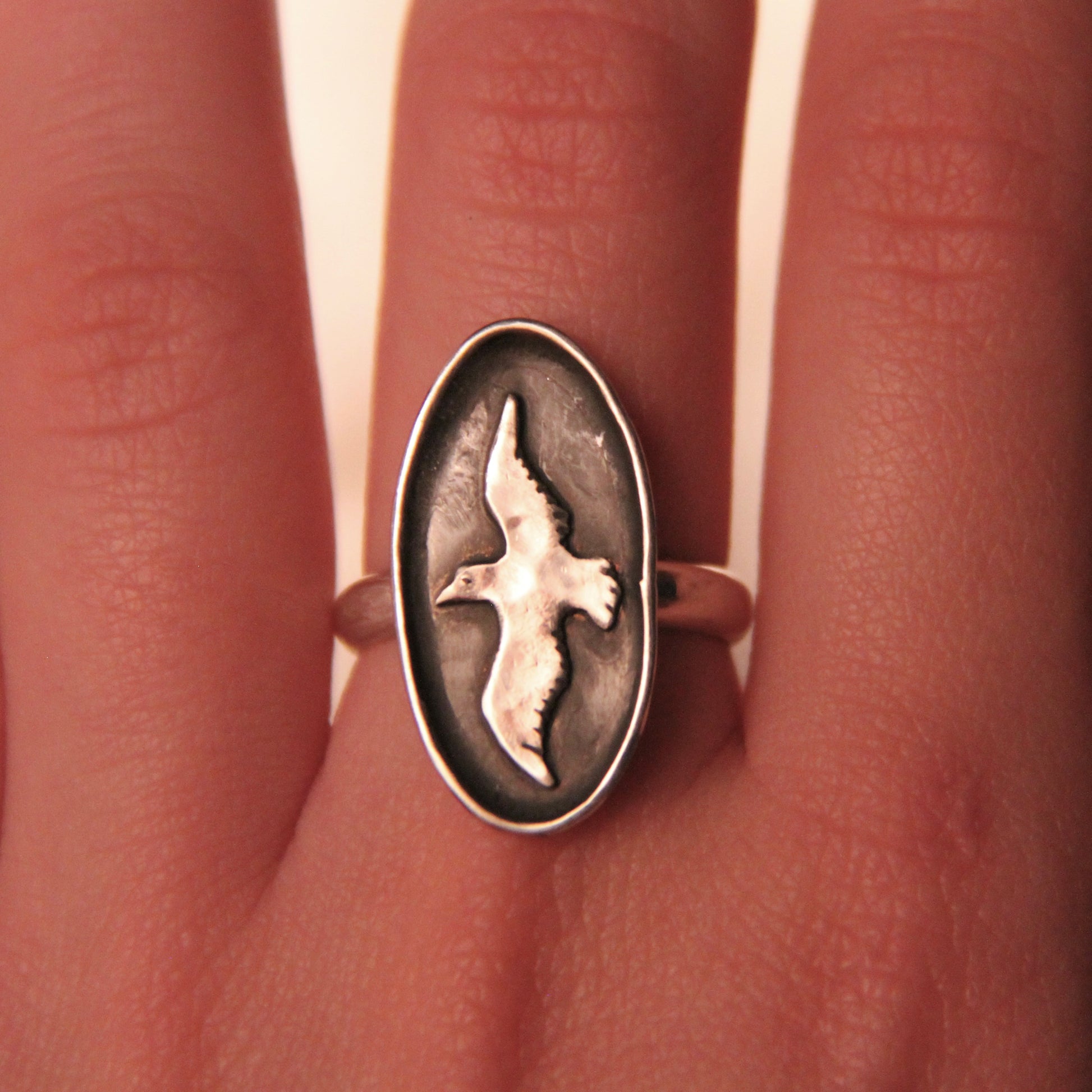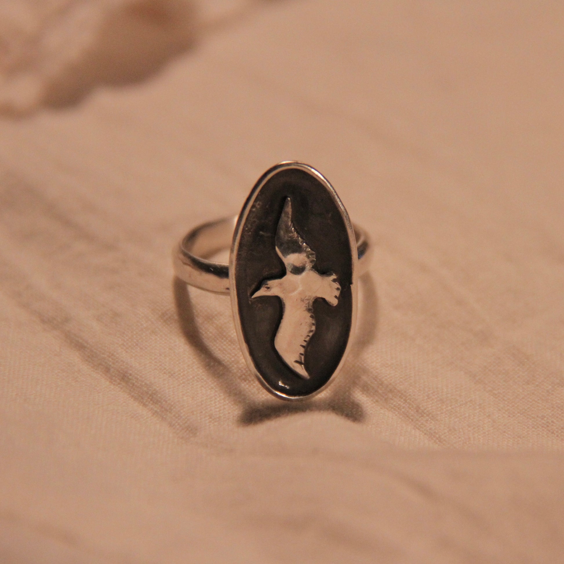 Delicate sterling silver ring featuring an intricate bird design. Crafted by hand with sterling silver for lasting shine and durability. Size 6.5. A timeless piece perfect for nature lovers or as a meaningful gift.