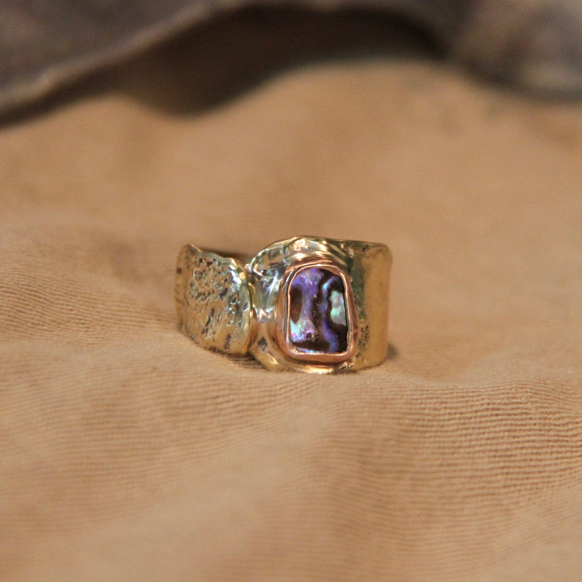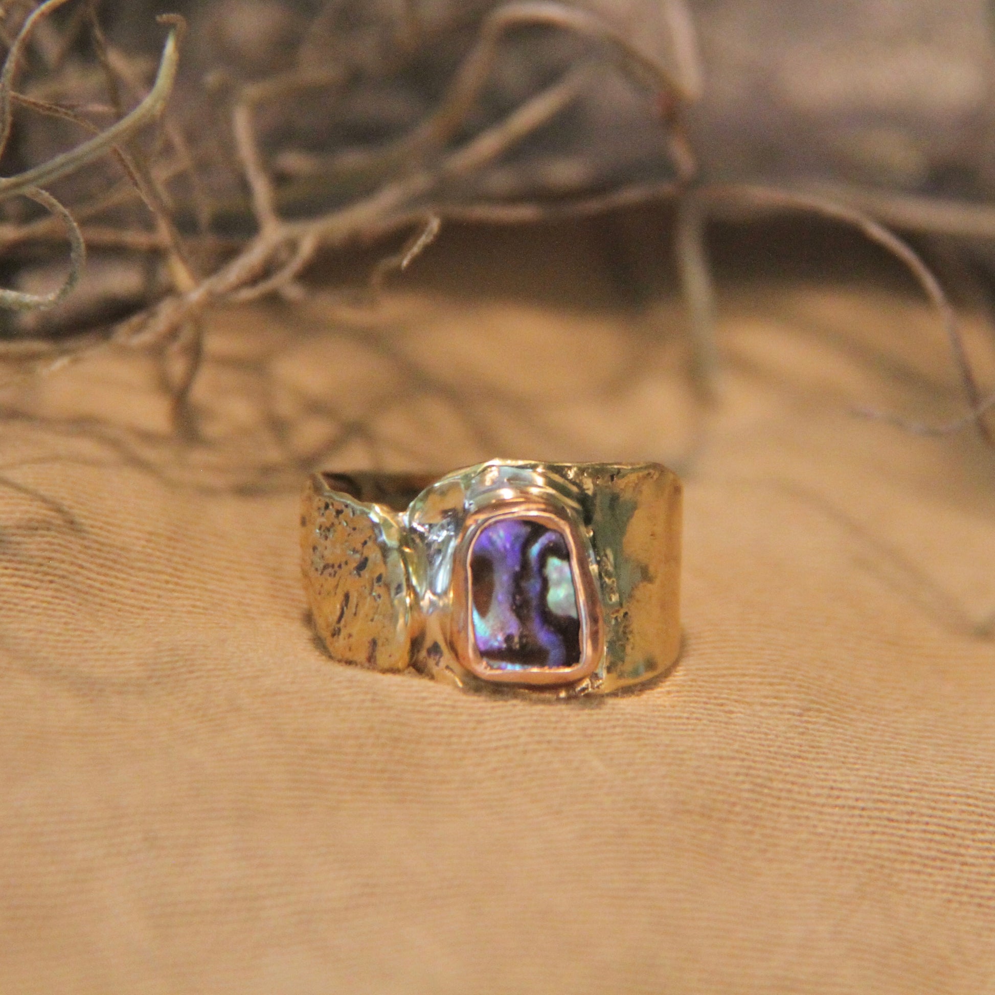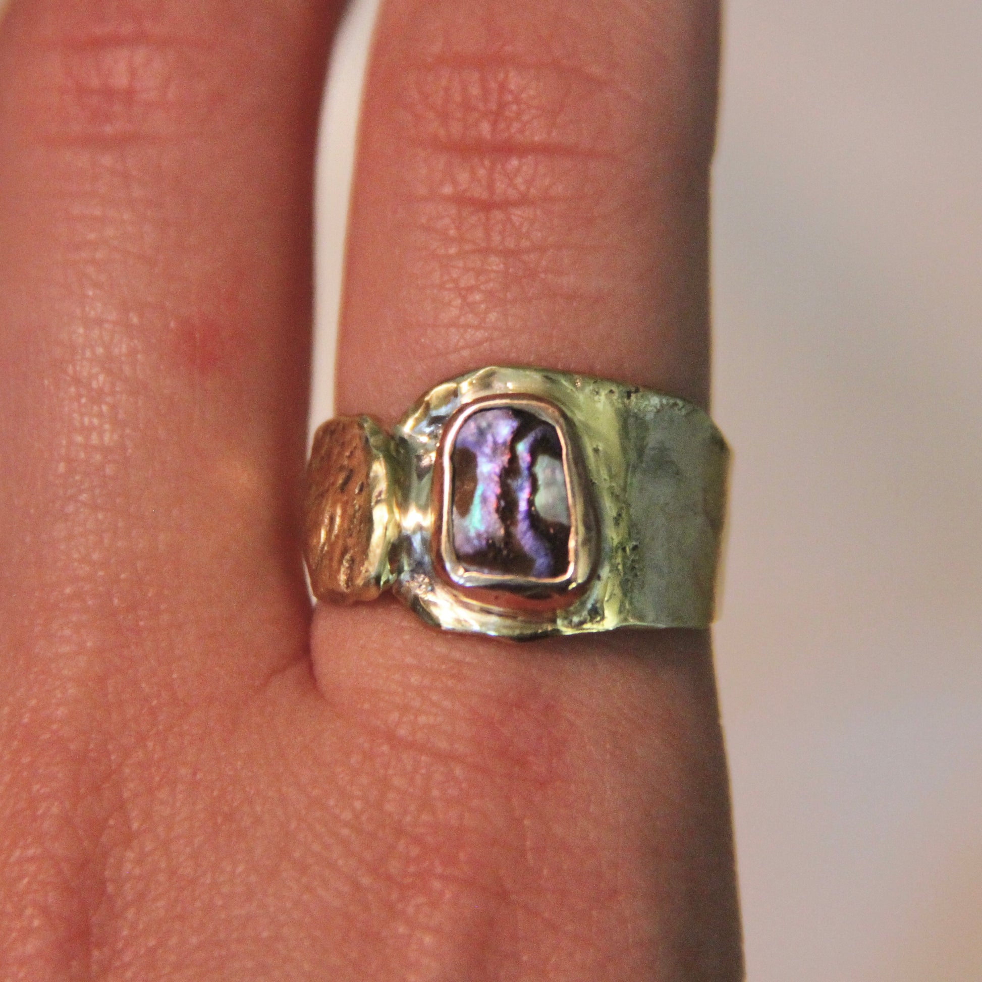 This unique handmade "Dragons Eye" ring features a stunning abalone shell set in brass. Sized at 8, the brass may naturally cause slight green discoloration on your fingers, which is normal and part of the ring’s charm. Enjoy wearing this beautiful piece that combines natural elegance with distinctive character.