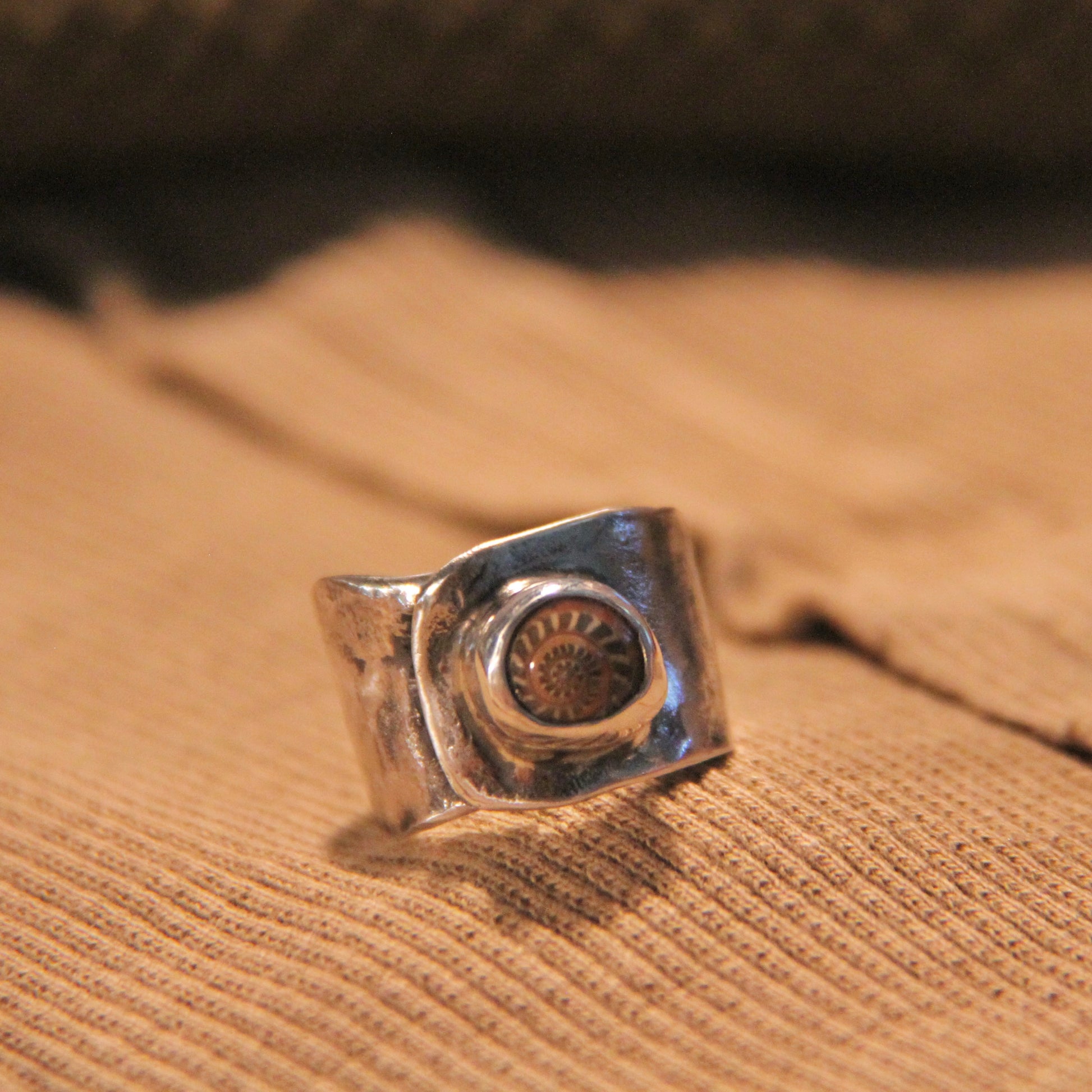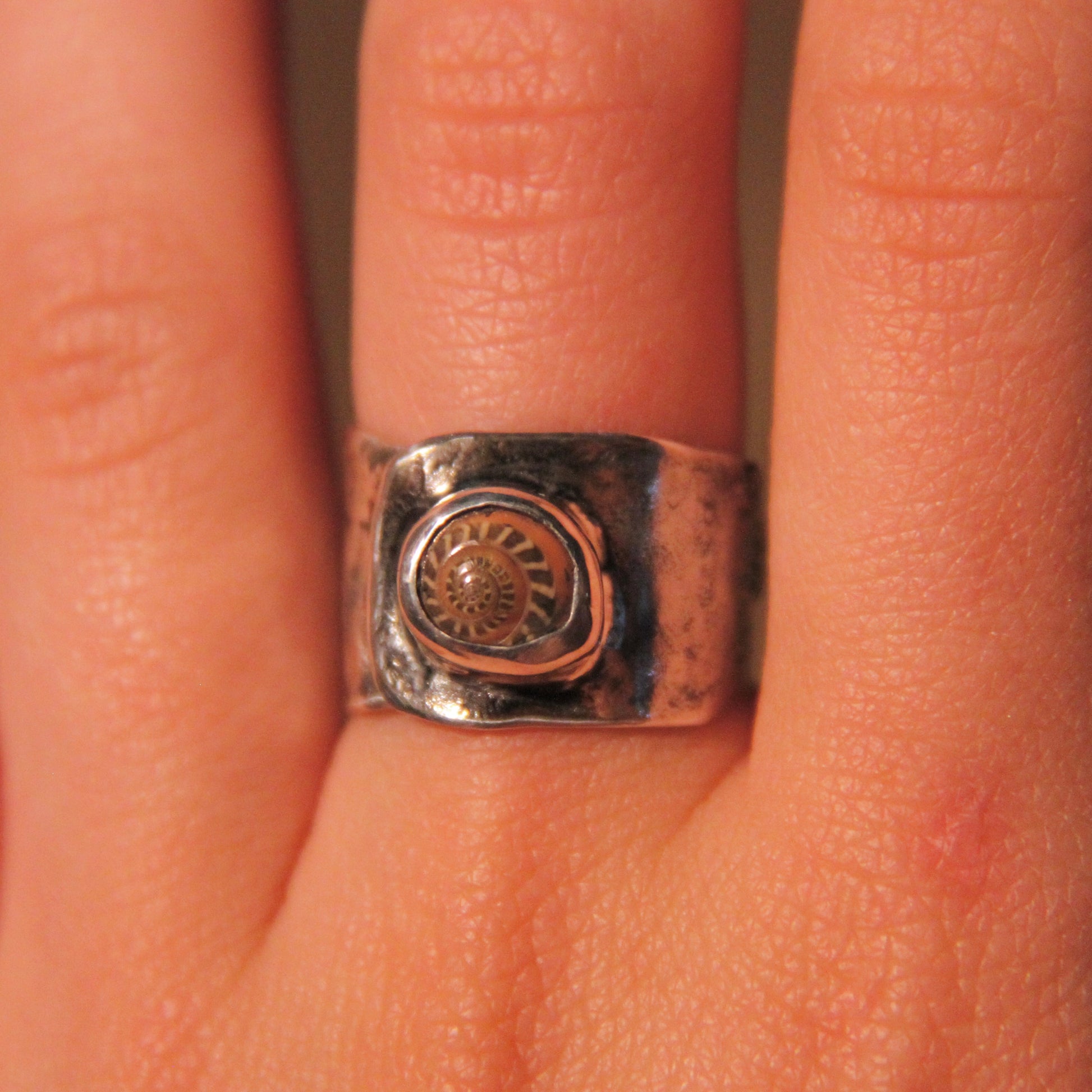 Elevate your style with our handmade sterling silver Fossil ring. Delicately crafted, this ring features a real seashell that adds a unique touch. Perfect for any occasion, it comes in size 6.5 and is the perfect addition to any outfit. Embrace a coastal vibe with our Fossil ring.