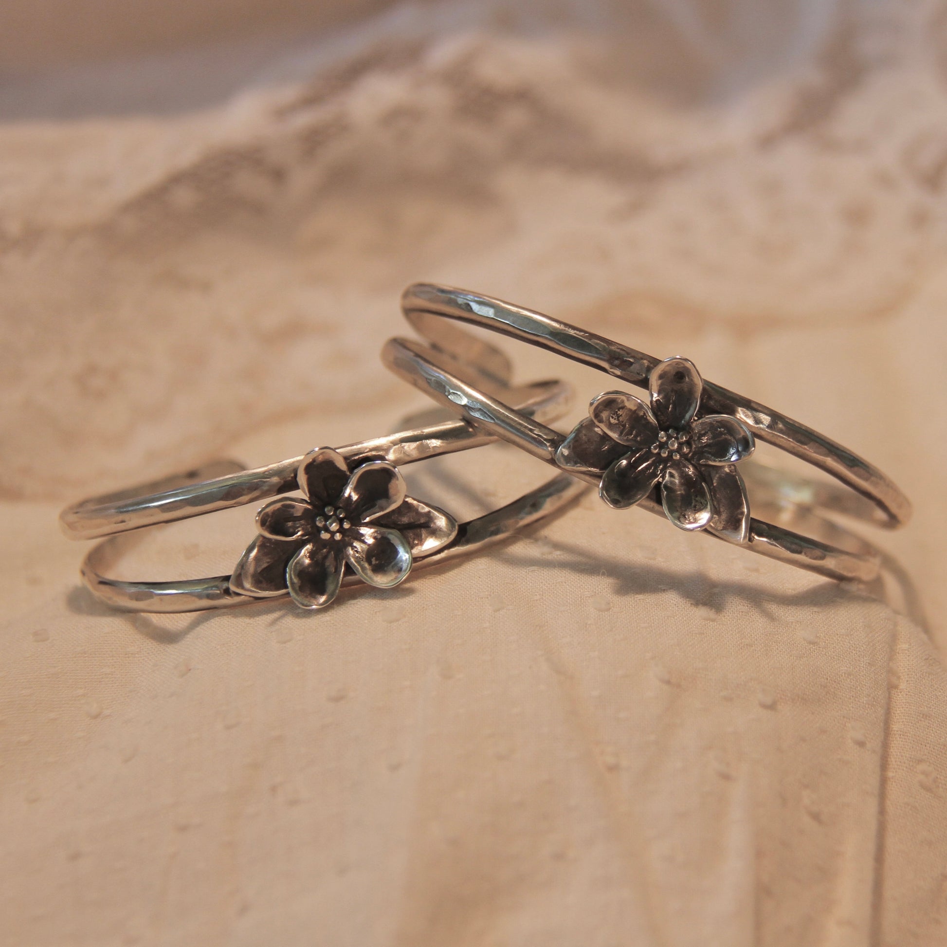 Crafted with care, the Lilly cuff features delicate handmade flowers on sterling silver, offering a unique and elegant touch. Slightly adjustable with a 5.5-inch circumference, it provides a comfortable fit while showcasing artisanal beauty. Perfect for adding a subtle yet meaningful accent to your everyday style. only comes with one bracelet.