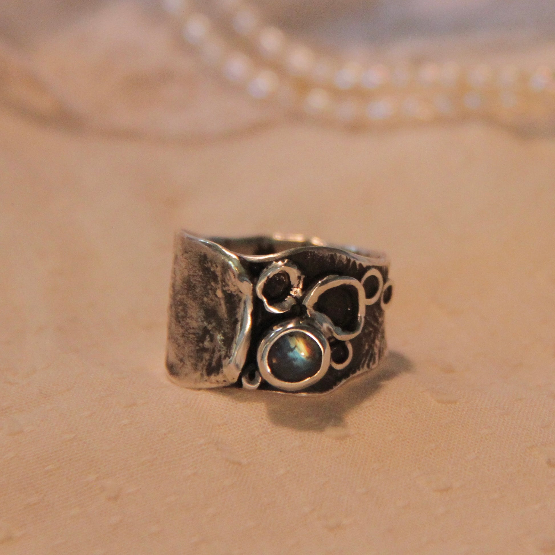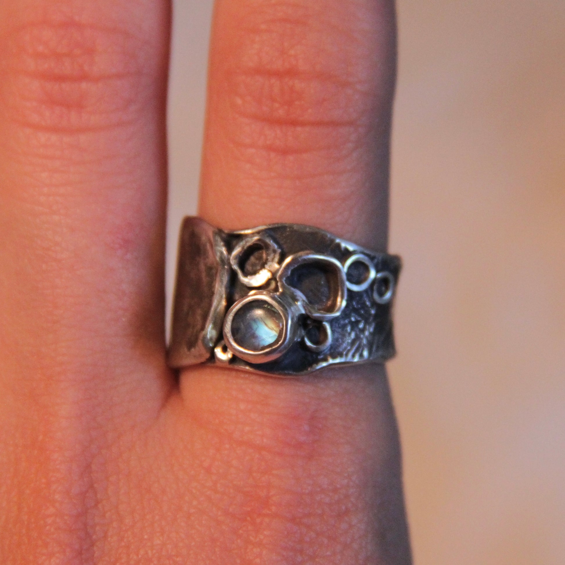 The Moonreef silver ring, size 8, features a stunning iridescent moonstone that catches the light beautifully. Its delicate bubble designs add a unique, elegant touch, making it a meaningful piece to complement any outfit.
