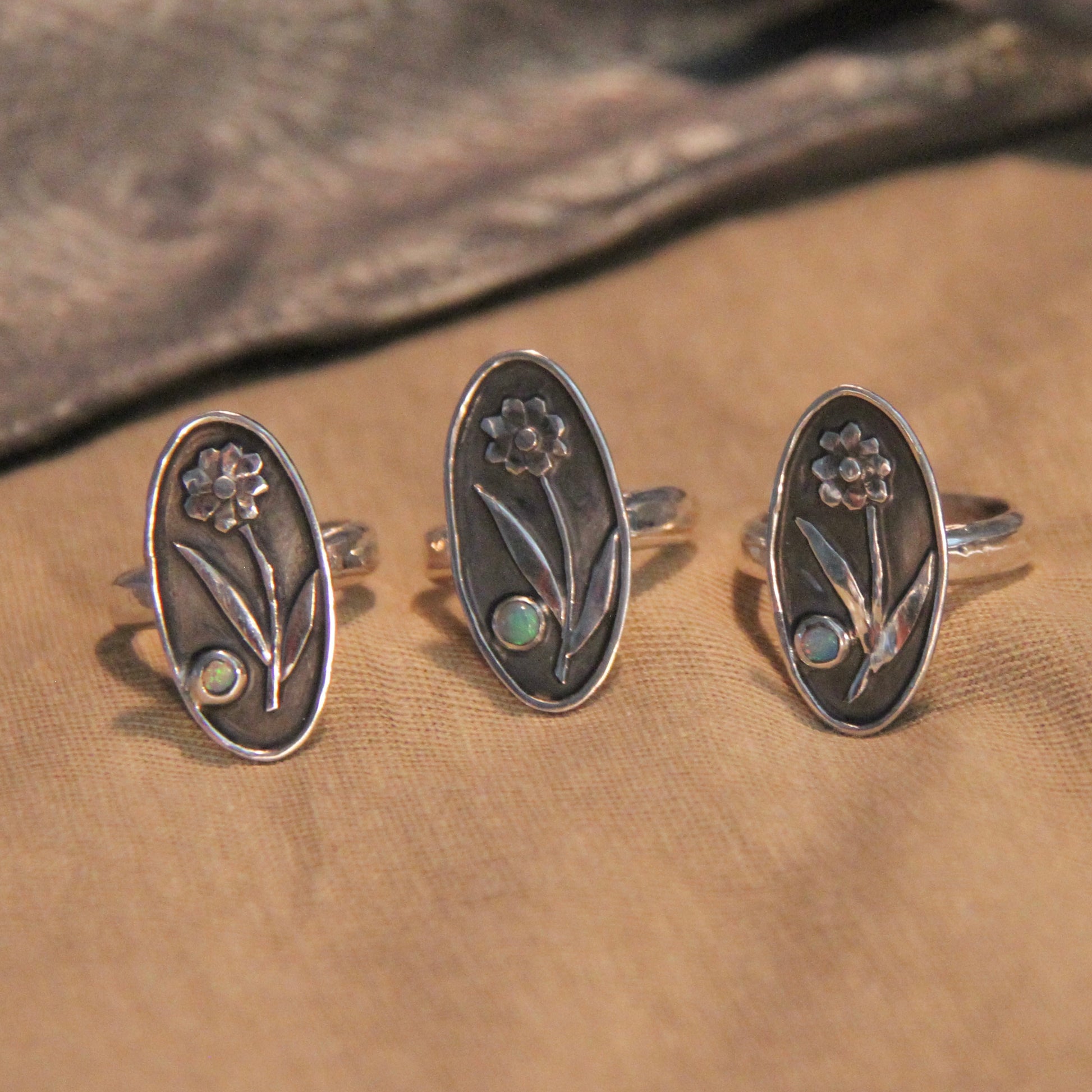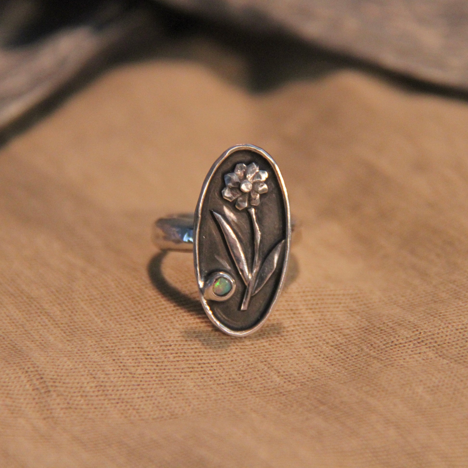 Celebrate October with this handcrafted sterling silver ring, designed to honor the month's natural symbolism. The opal birthstone pairs beautifully with delicate cosmos Octobers birth flower, creating a piece that feels both personal and timeless. Meticulously made by hand, each ring carries its own character and charm.