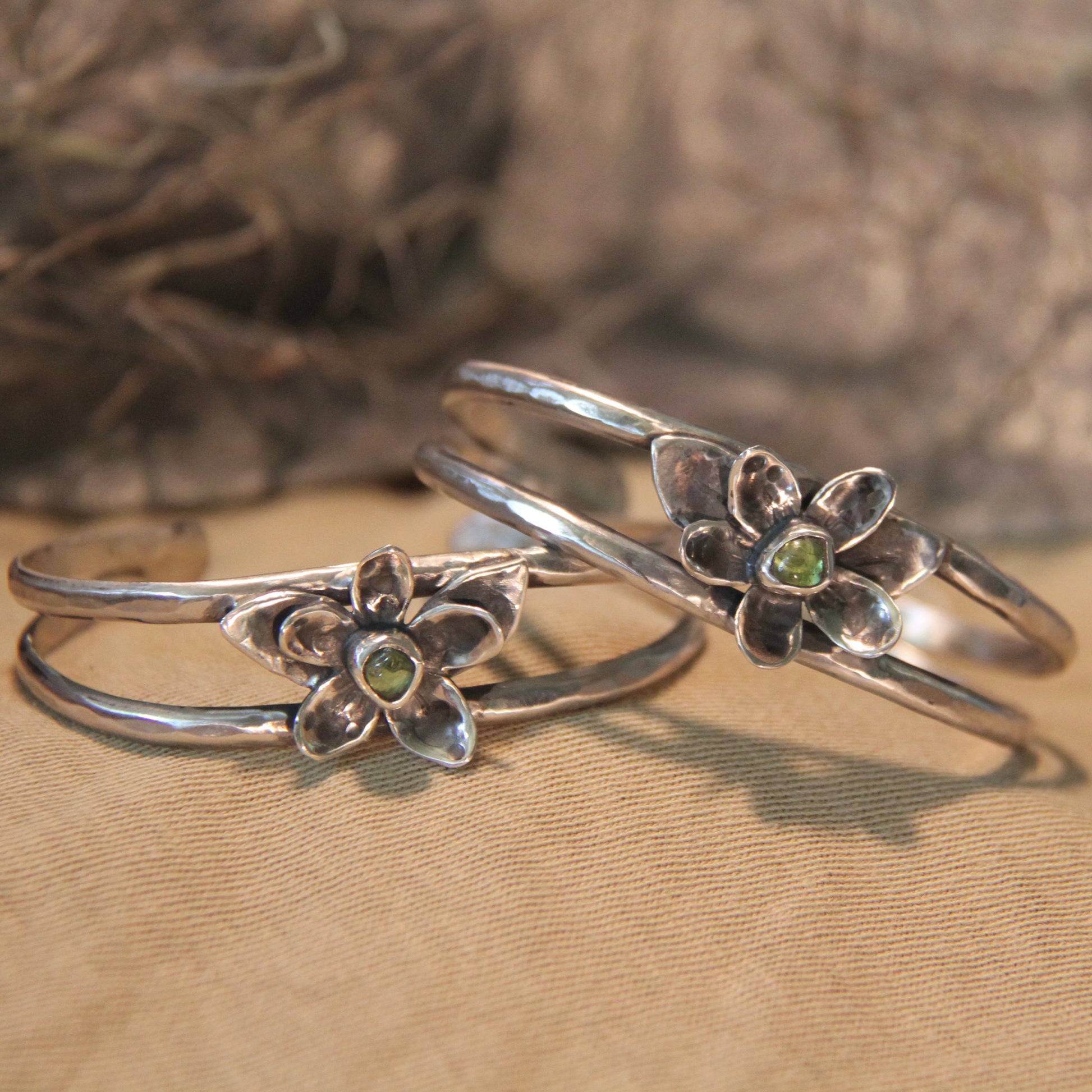 This delicate, handmade sterling silver bracelet features a unique flower design accented by a vibrant peridot stone. With an adjustable fit, it offers both elegance and comfort. Perfect for adding a subtle touch of nature-inspired beauty to any outfit.