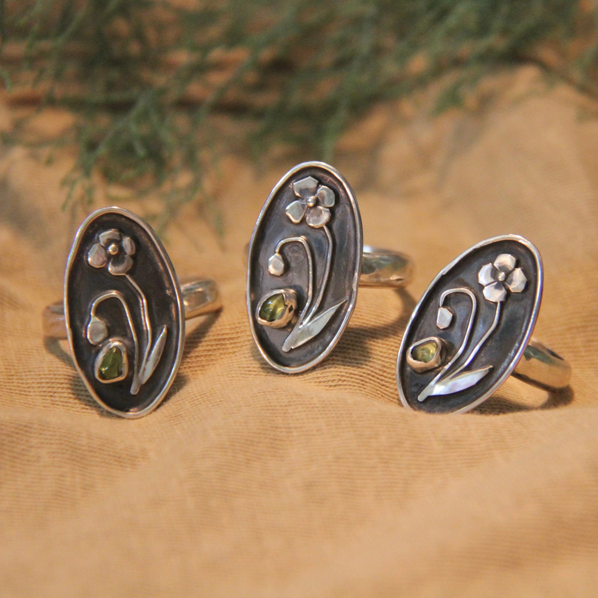 The Peridot Poppy ring beautifully captures the essence of August with its elegant poppy design, inspired by the birth flower of the month. Featuring a radiant peridot stone, August’s birthstone, this unique piece offers a heartfelt way to celebrate and support those born in August. Its meaningful symbolism makes it a perfect gift to honor growth and new beginnings. The size 7 ring is marked down because of a small hole in bezel still perfectly functional.