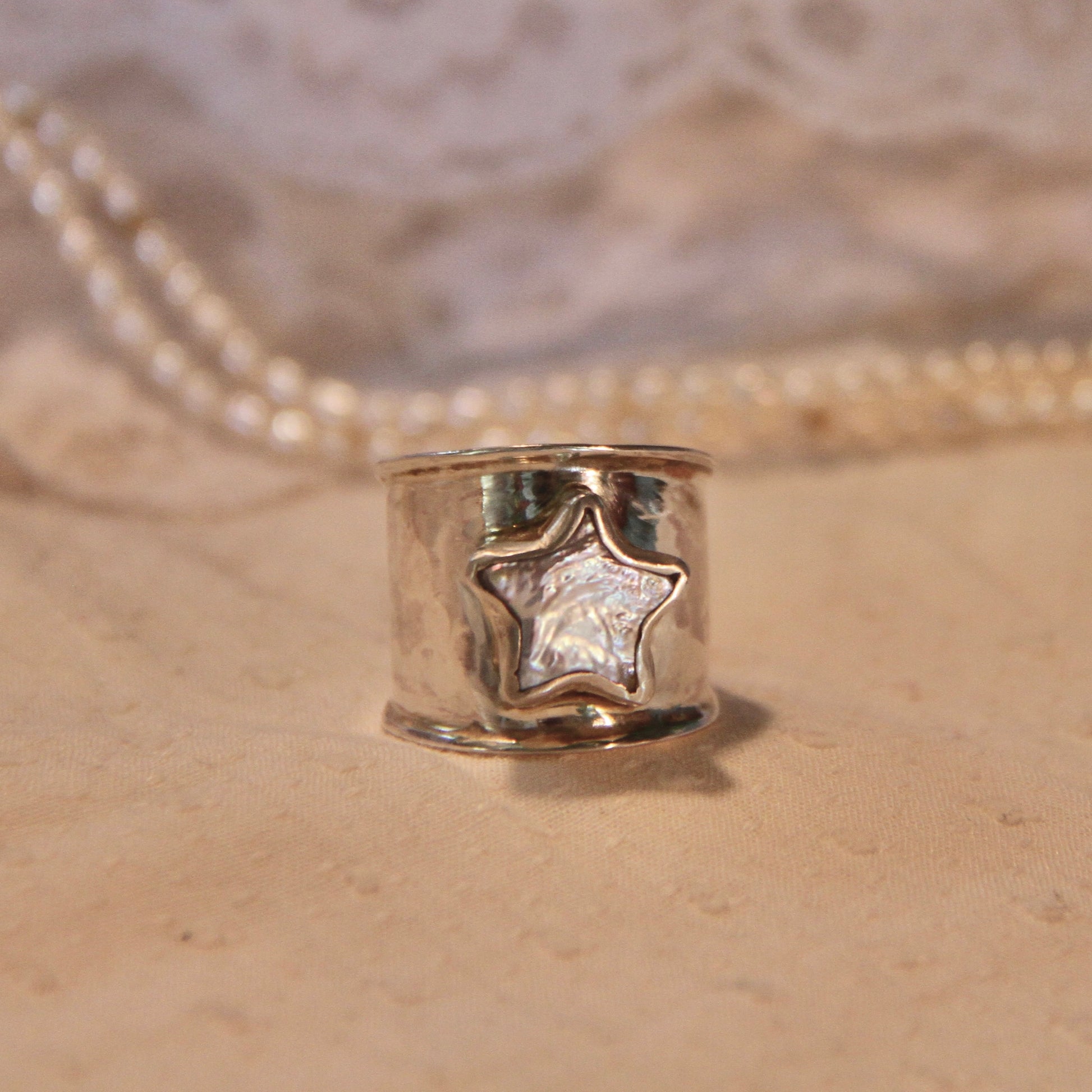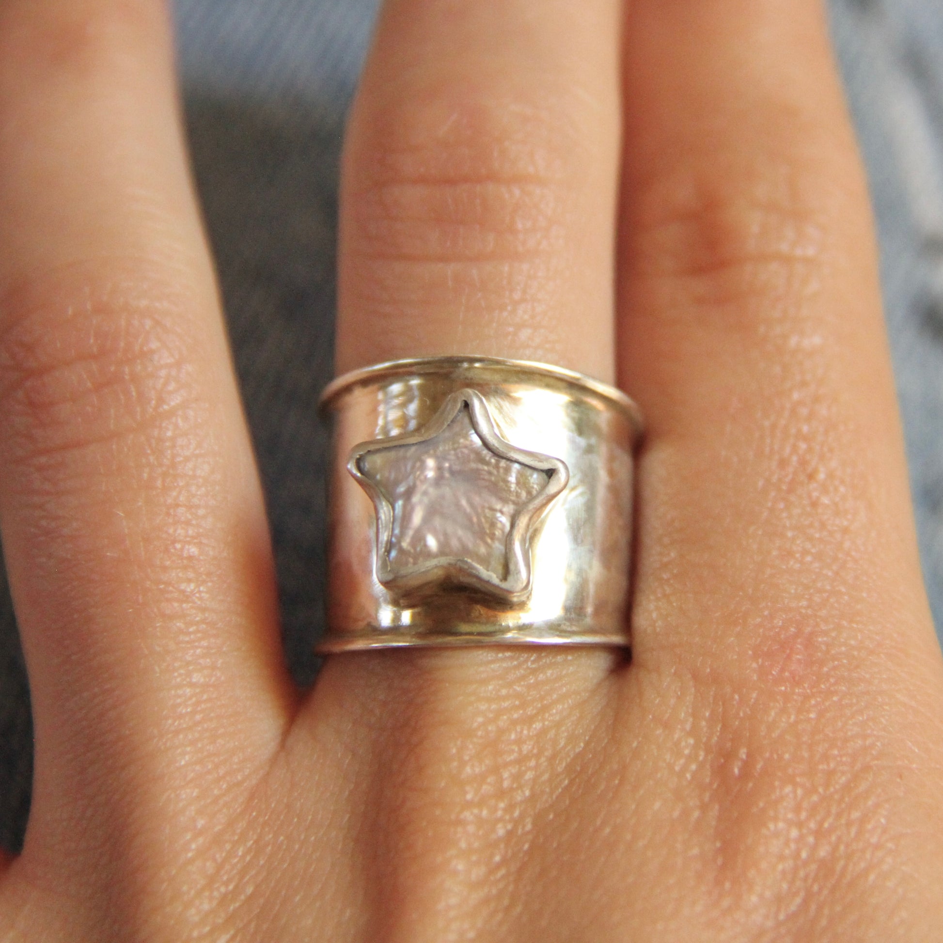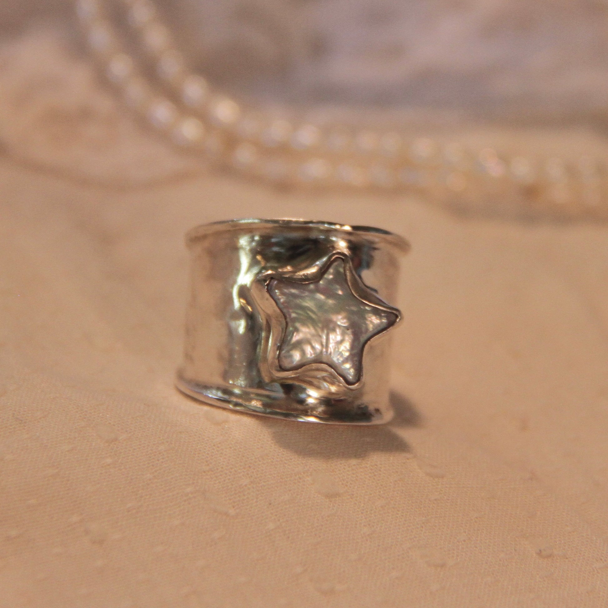 The Starpearl ring features a delicate silver design with a unique star pearl centerpiece. Each ring is handcrafted, making every piece truly one of a kind. Please note that because it is handmade, slight variations from the pictured ring may occur. This ring comes in a size 7, offering a perfect fit while showcasing artisanal charm.