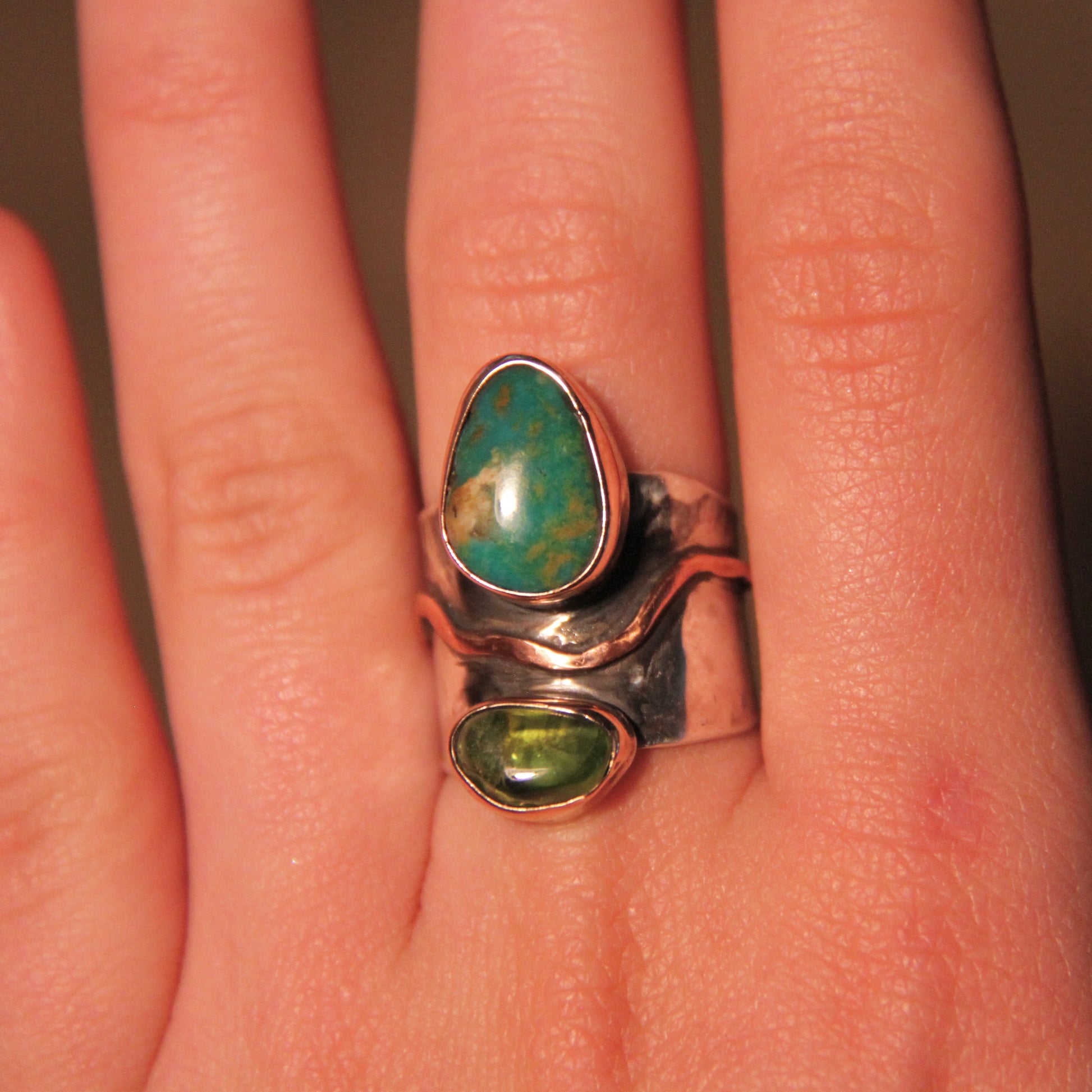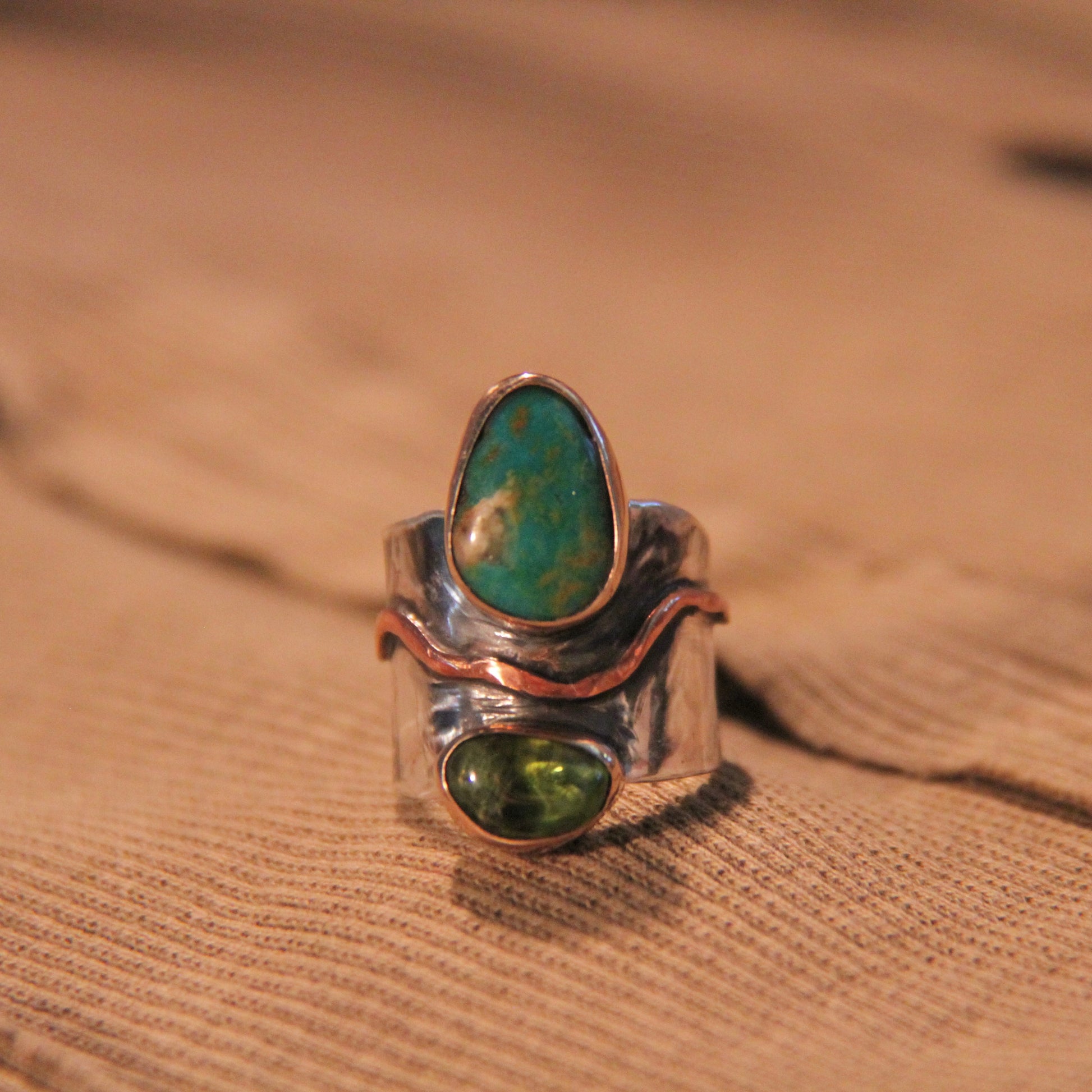 This stunning handmade Turquoise Horizon ring features a size 6.7 sterling silver band with intricate copper veining. The ring boasts two gorgeous stones - a vibrant turquoise and a sparkling peridot - accented by a copper bezel wrap. A unique and eye-catching addition to any jewelry collection.